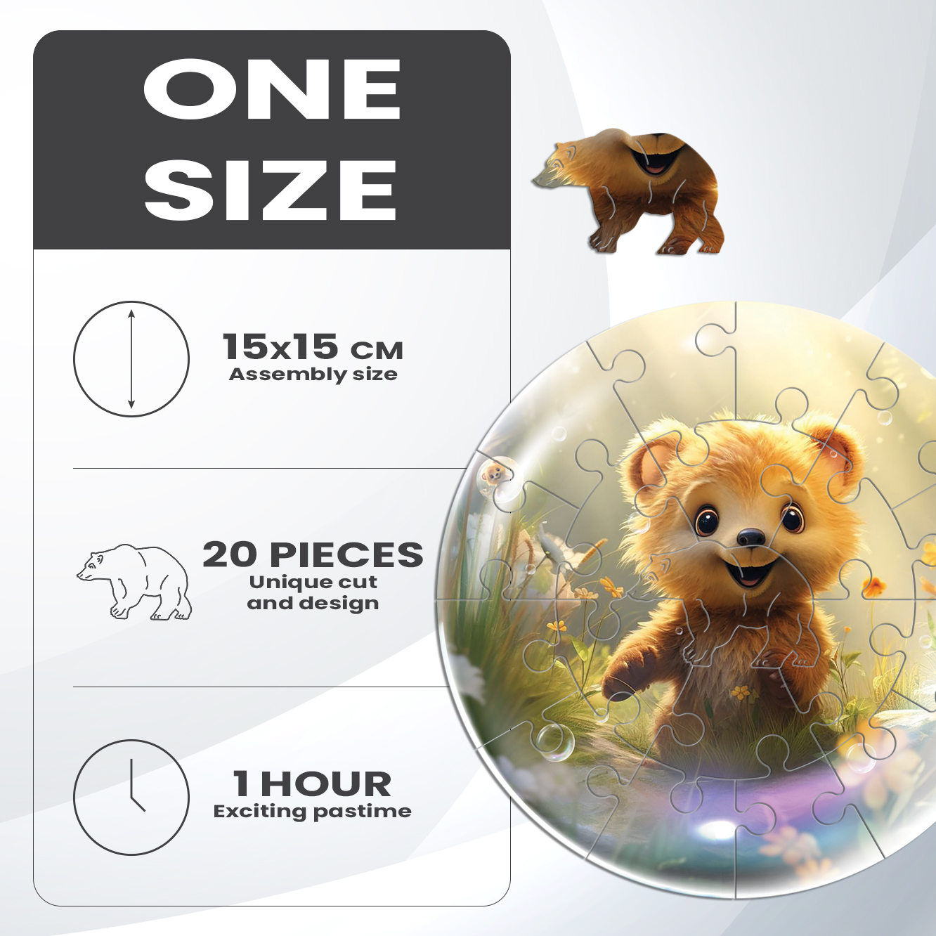 One Size – 15×15 cm (5.9×5.9 in) – 20 pcs – easy complexity, age 3+, puzzling time 1-2 hours