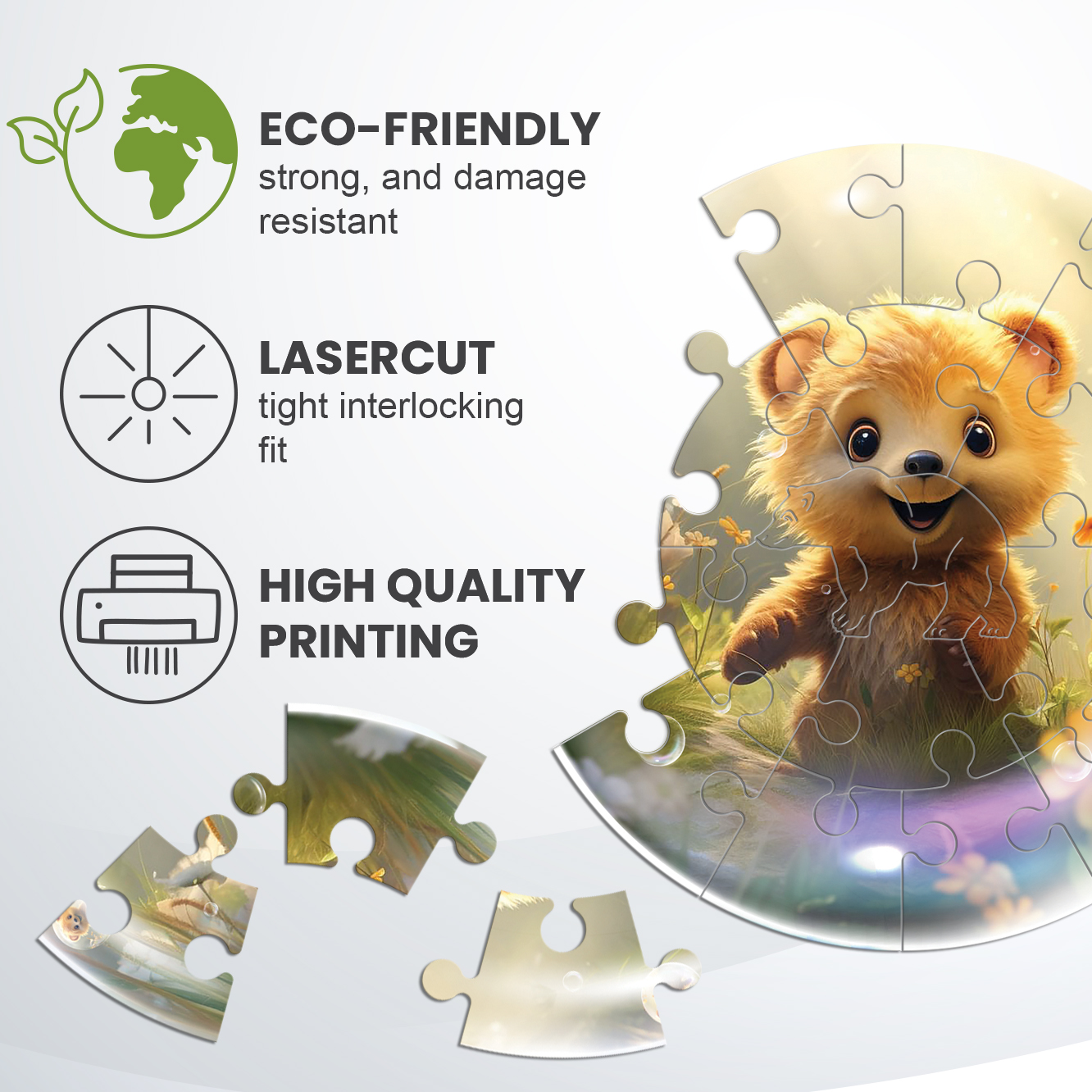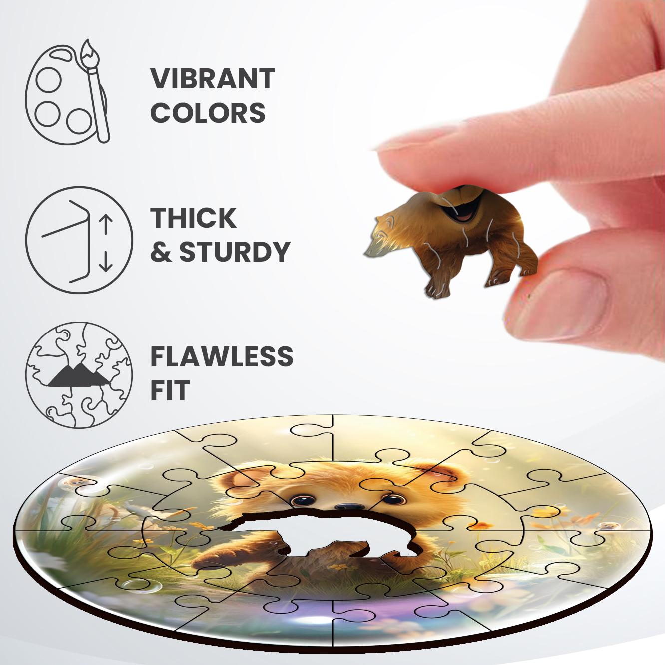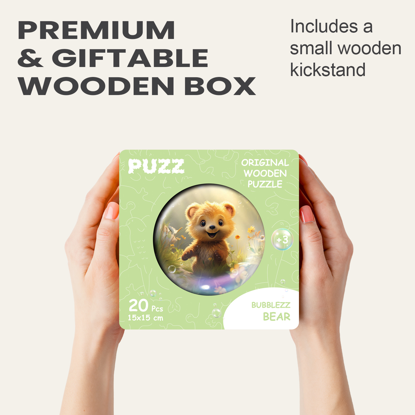 Introducing the Bubblezz series from PUZZ — the cutest and most fun puzzles for little ones! Imagine your child’s delight as they gaze into a transparent soap bubble and discover a cute, big-eyed creature with a precious snout and playful paws. With up to fifteen adorable animals to collect, each puzzle is specially designed to capture the hearts and minds of young puzzle enthusiasts. With 20 bright and charming pieces made from natural materials, these puzzles are not only fun but also educational. They help to develop fine motor skills, logic, and attention, making them perfect for children aged 3 to 5 years old. The pieces are easy to hold, and fits perfectly with the others, making the puzzle-solving experience smooth and enjoyable. Your child won’t even realize how fast time flies as they assemble their puzzle, and you’ll be delighted to see them having so much fun with a toy that is both stimulating and safe. Don’t miss out on this one-of-a-kind puzzle series that will keep your child entertained, engaged, and learning playfully! Order yours now!
