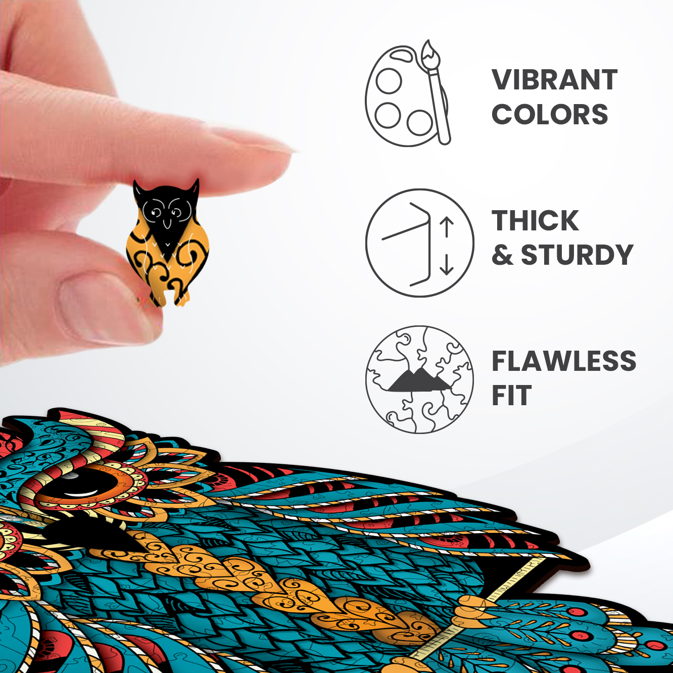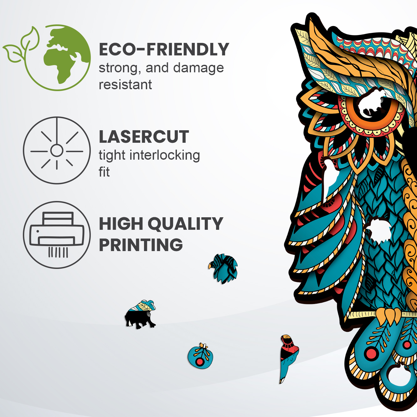For wisdom, the forest animals come to the Charming Owl. You will believe this when you begin to build this puzzle. During your journey to the heart of the deep forest, you will meet a deer looking for the Owl’s advice, a tiny hedgehog that makes funny noises, and a rabbit who’s always alert for predators. The puzzle gives out a pleasant wood smell, the flawlessly cut parts join together smoothly. Is it magic? Maybe !